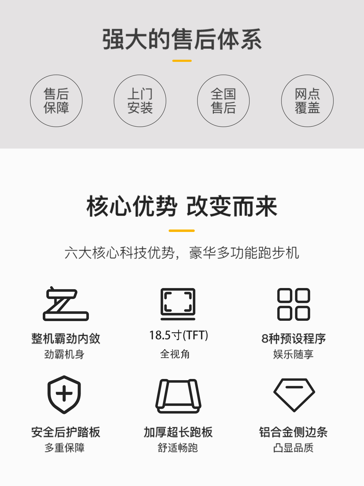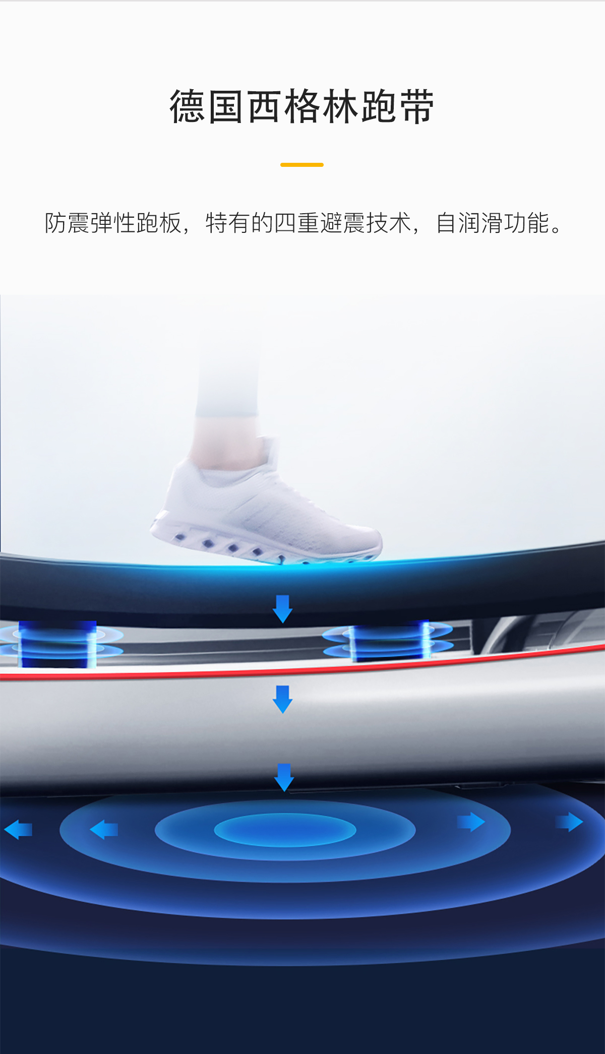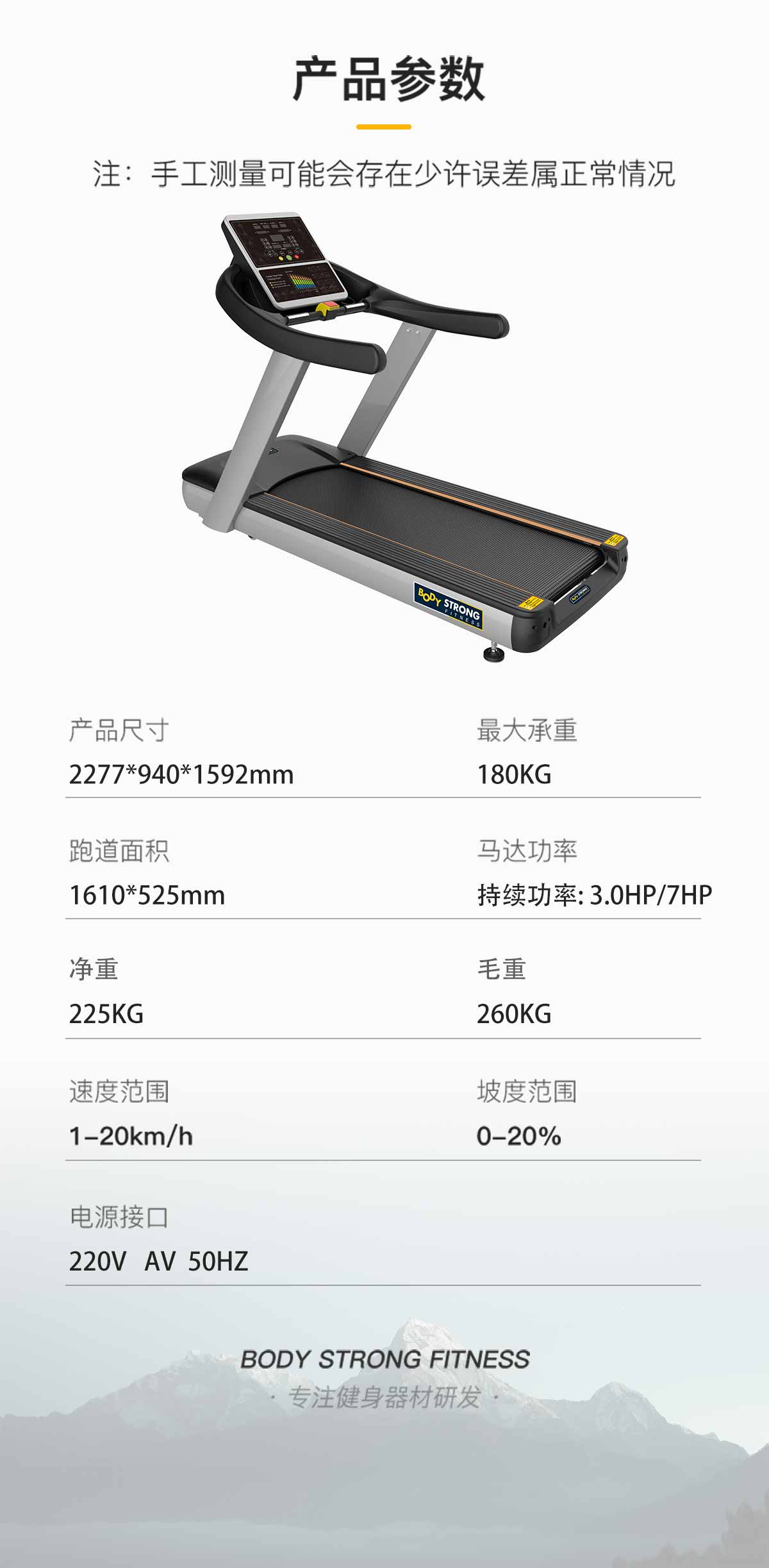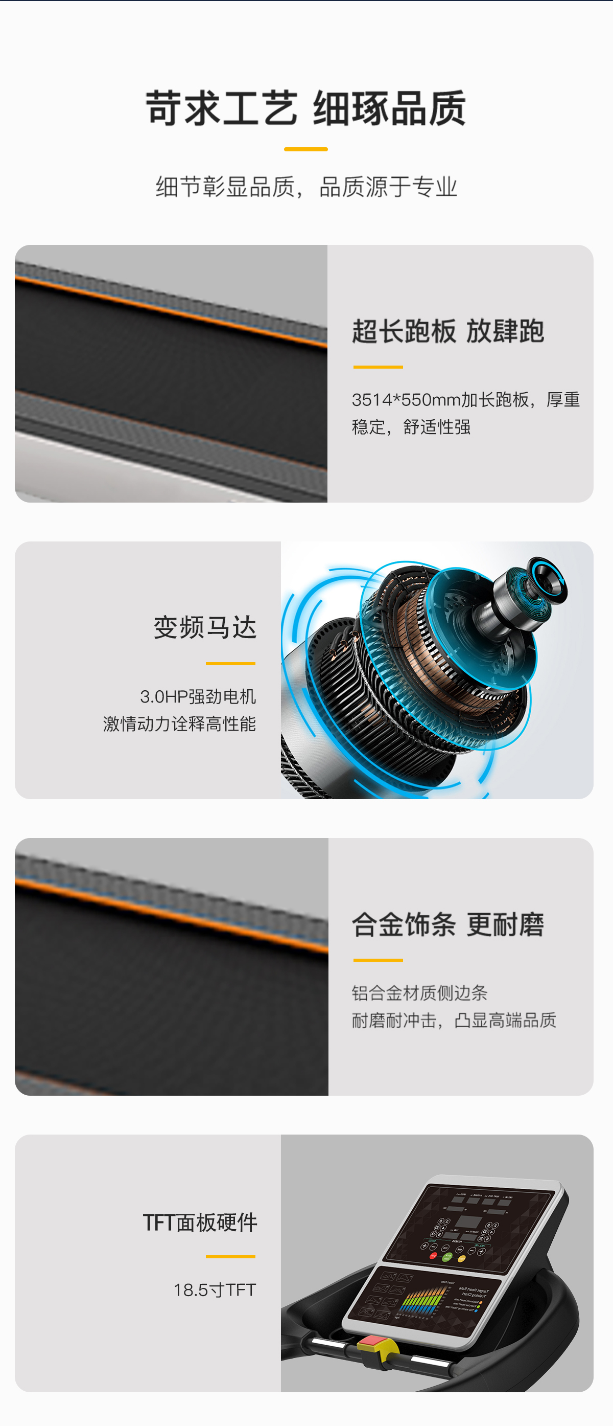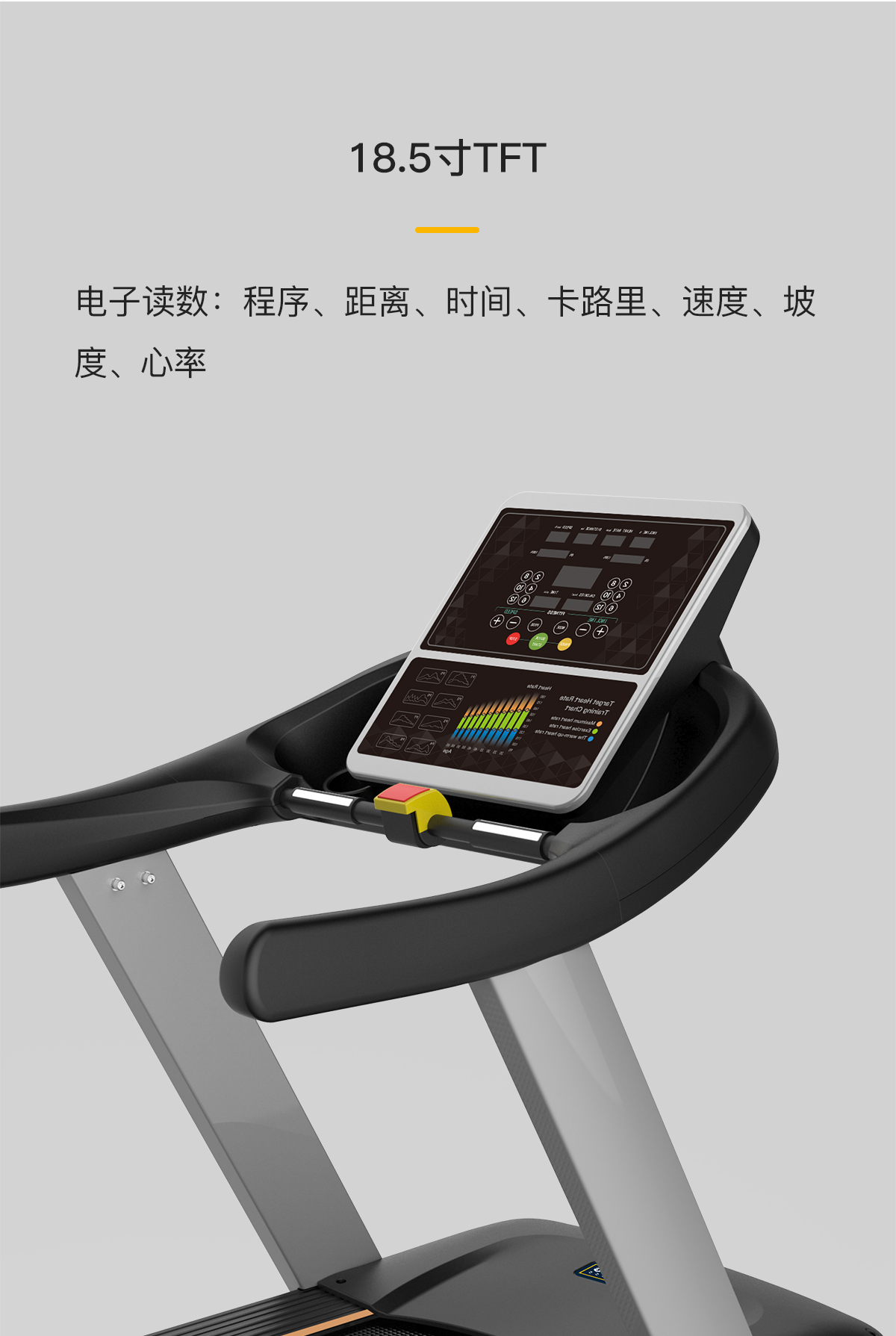 18.5寸LCD高清分辨率液晶显示屏,智能心率系统,防震弹性跑板,特有的四重避震技术,自润滑功能,USB:可连接移动外接设备